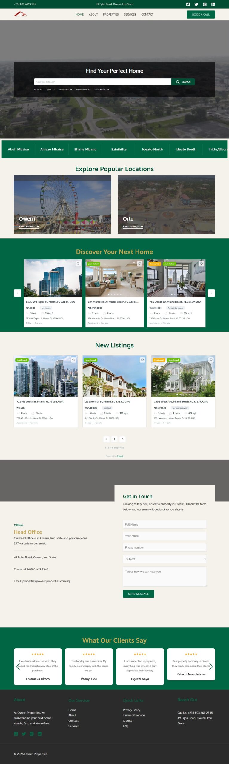A real estate website for Owerri Properties, showcasing property listings with a clean layout and user-focused browsing experience.