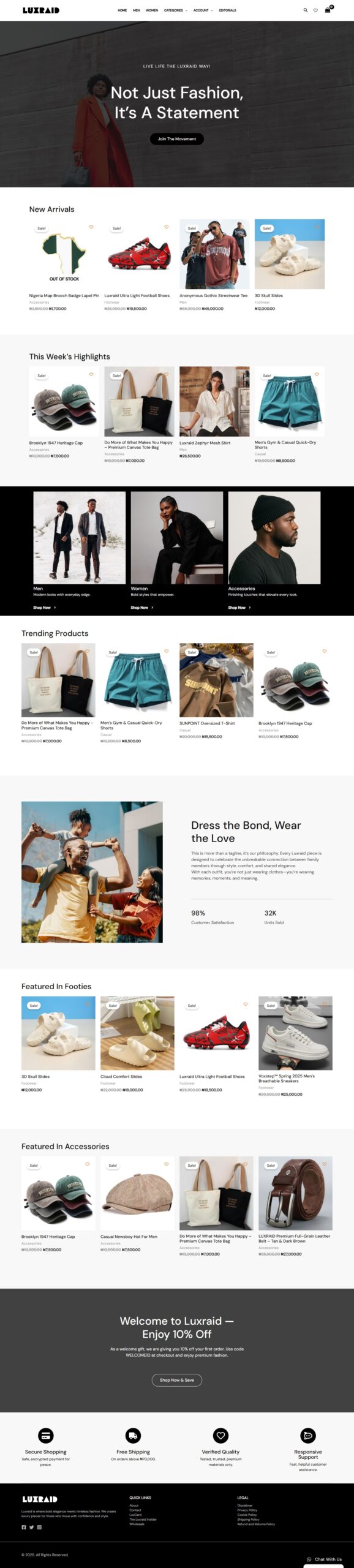 A modern ecommerce store built for Luxraid, showcasing premium fashion products with a sleek shopping experience.