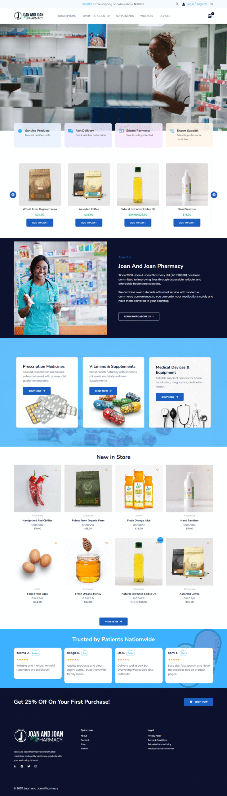 An ecommerce pharmacy website for Joan And Joan Pharmacy, offering trusted healthcare products with a clean, user-friendly interface.